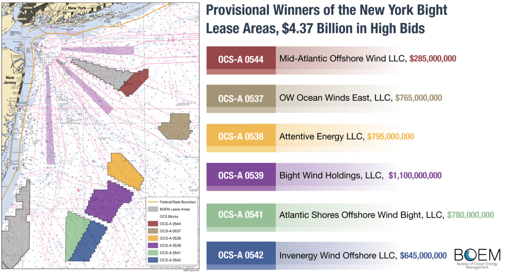 The United States government netted a record $4.37 billion from the sale of six offshore wind leases off the coasts of New York and New Jersey, a major milestone towards achieving the Biden-Harris administration’s goal of reaching 30 gigawatts of offshore wind energy by 2030. The lease sale offered six lease areas totaling over 488,000 acres in the New York Bight for potential wind energy development.