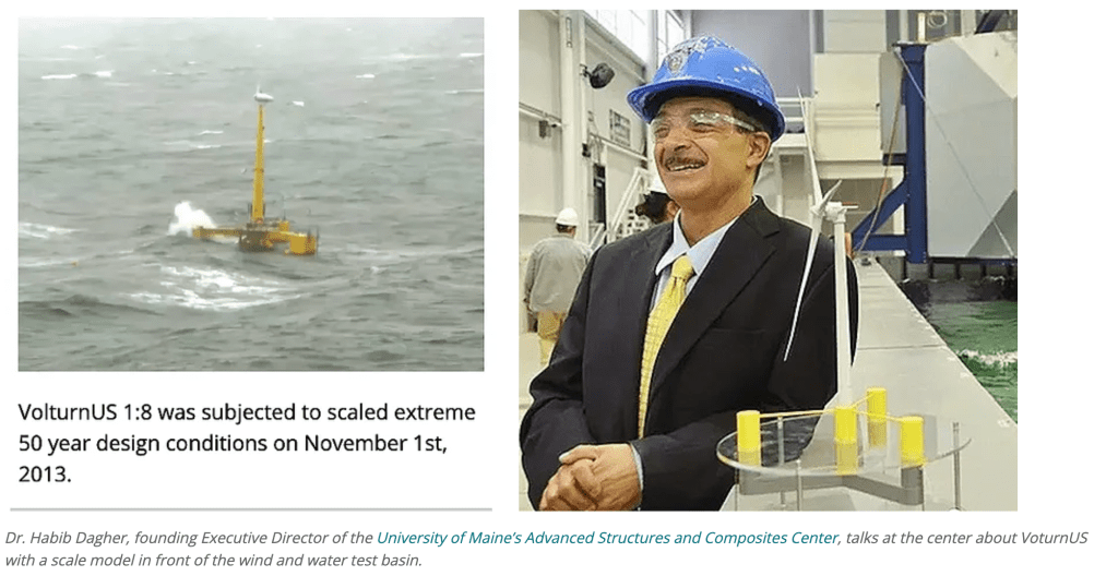 The VolturnUS, designed by Habib Dagher off the coast of Maine. It was the first offshore wind floating turbine that provided electricity to the US grid. Photo Ramona du Houx
