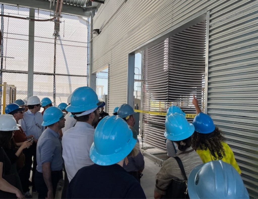 People on a 2024 tour of the direct air capture facility in Tracy examine trays of limestone designed to react with atmospheric carbon dioxide. (Ellie Cohen/The Climate Center)